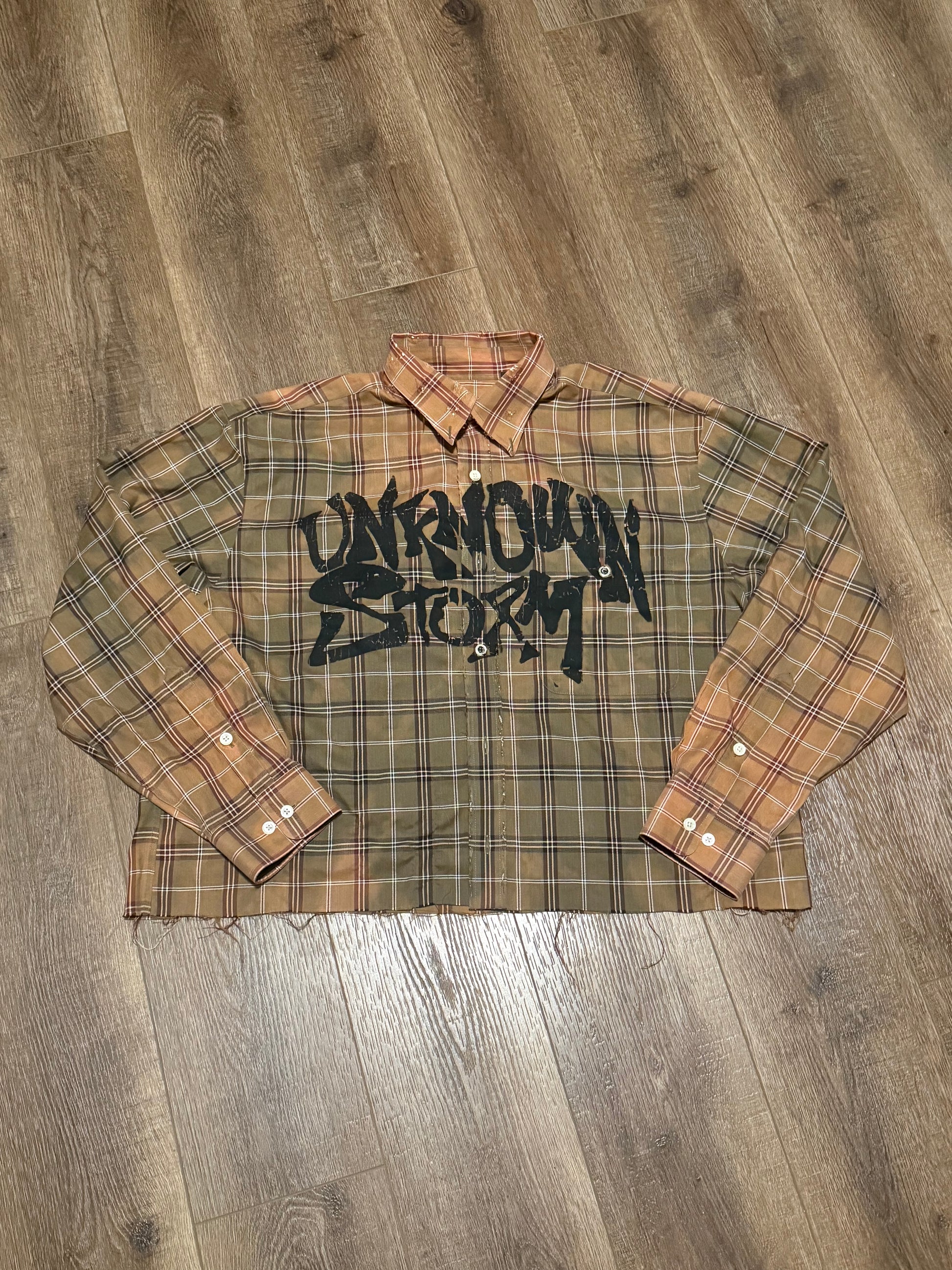 Expertly crafted from upcycled materials, this 1 of 1 cropped button up features a unique screen printed design. Each piece is one-of-a-kind, making it a sustainable and stylish addition to any wardrobe. Elevate your fashion game while reducing your environmental impact.