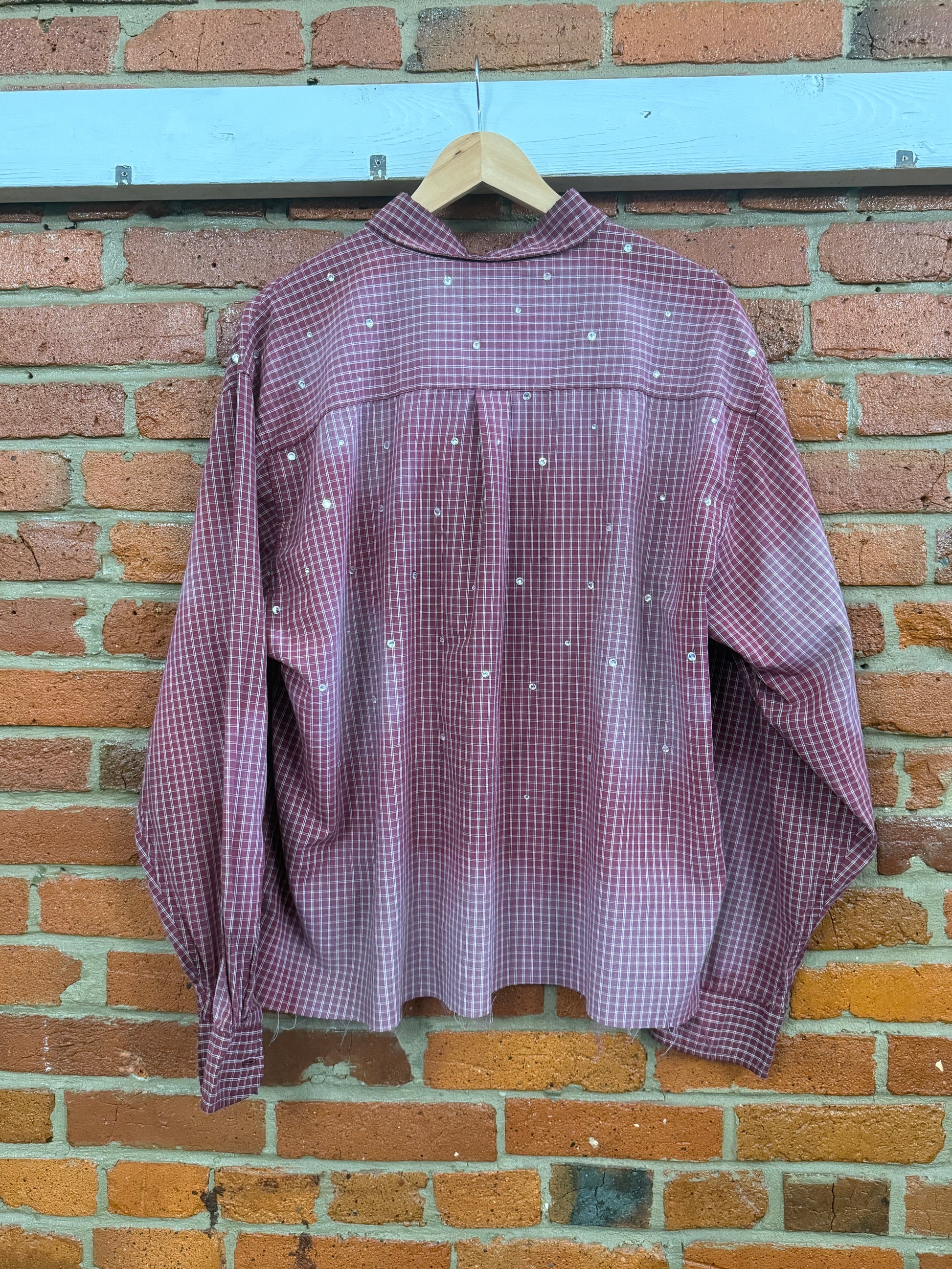 This 1 of 1 cropped Rhinestone button up is expertly upcycled to provide a unique and sustainable addition to your wardrobe. Each piece is crafted with precision and creativity, making it truly one-of-a-kind. Embrace your individuality with this environmentally-friendly and stylish top.