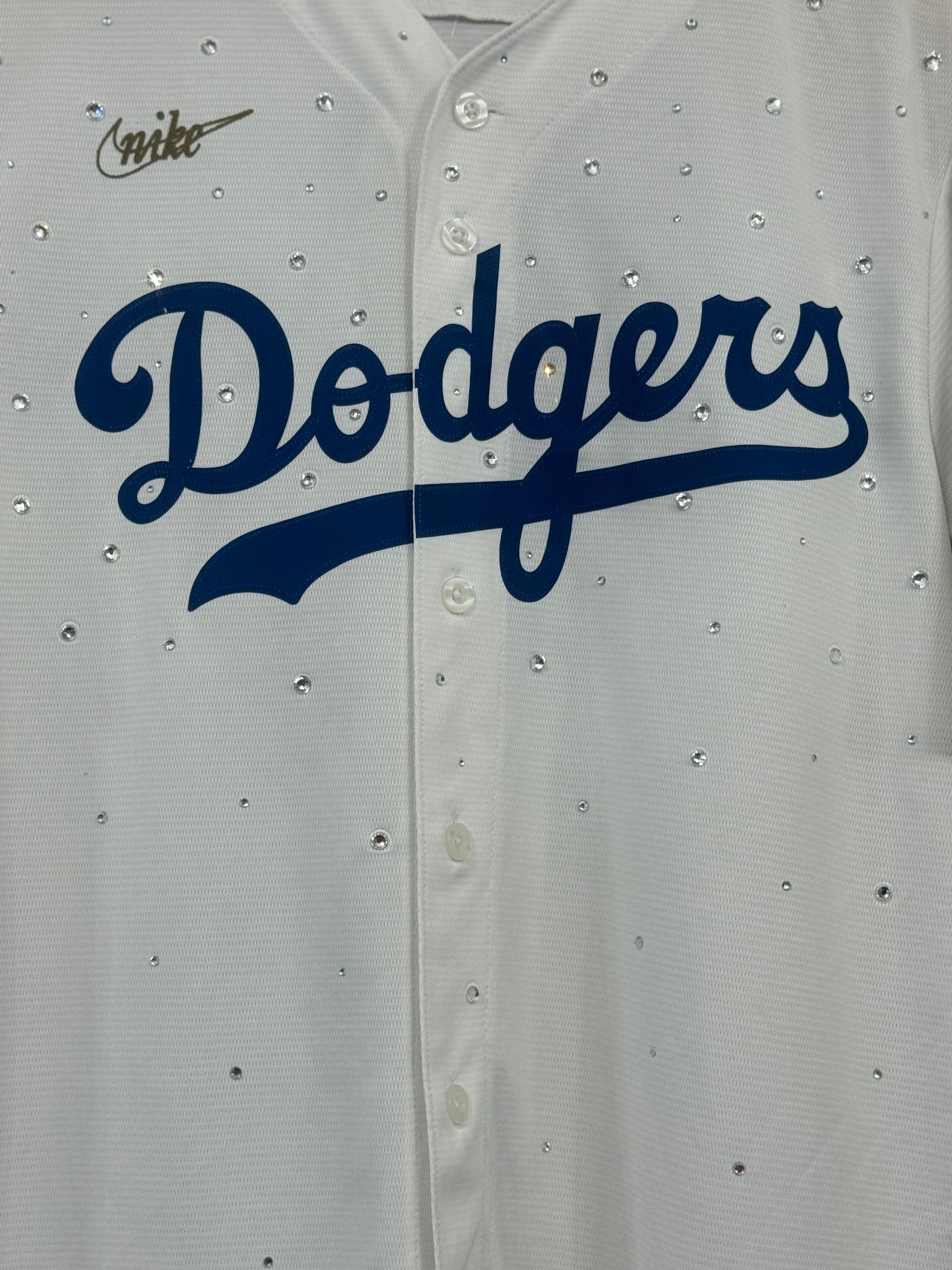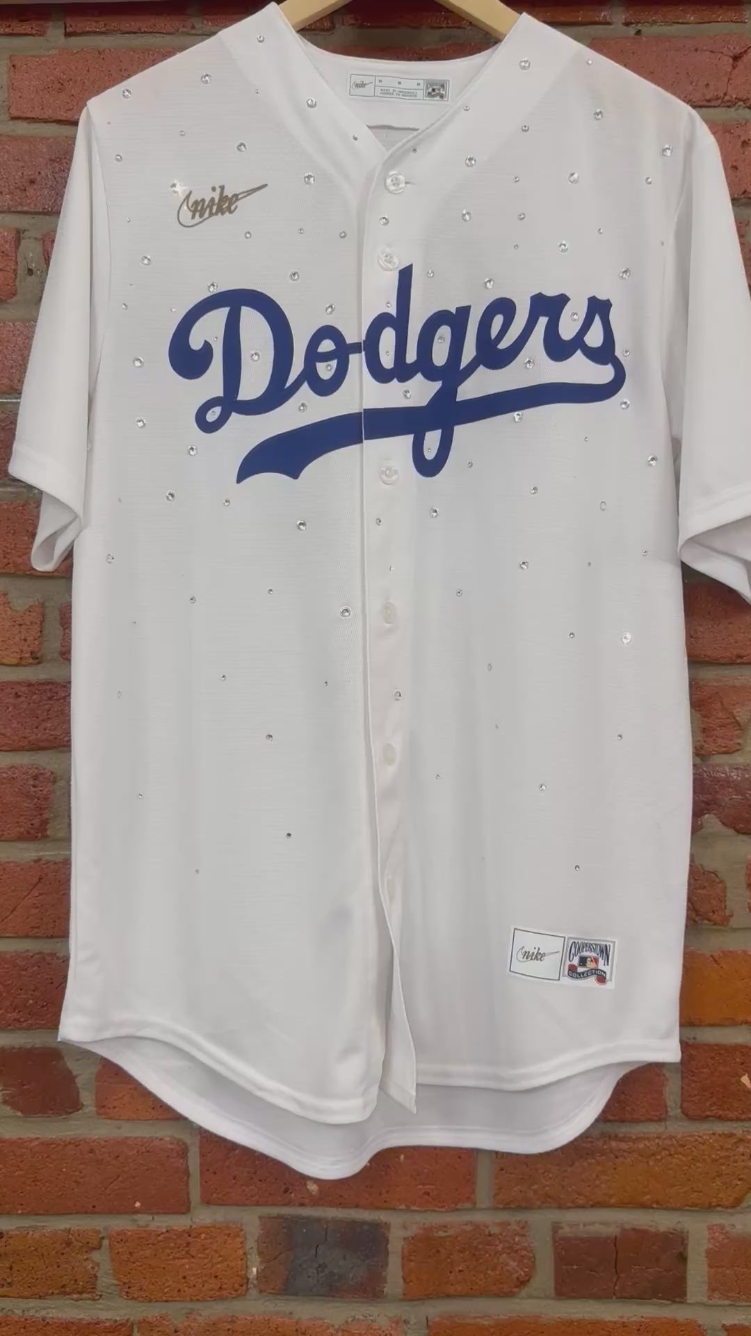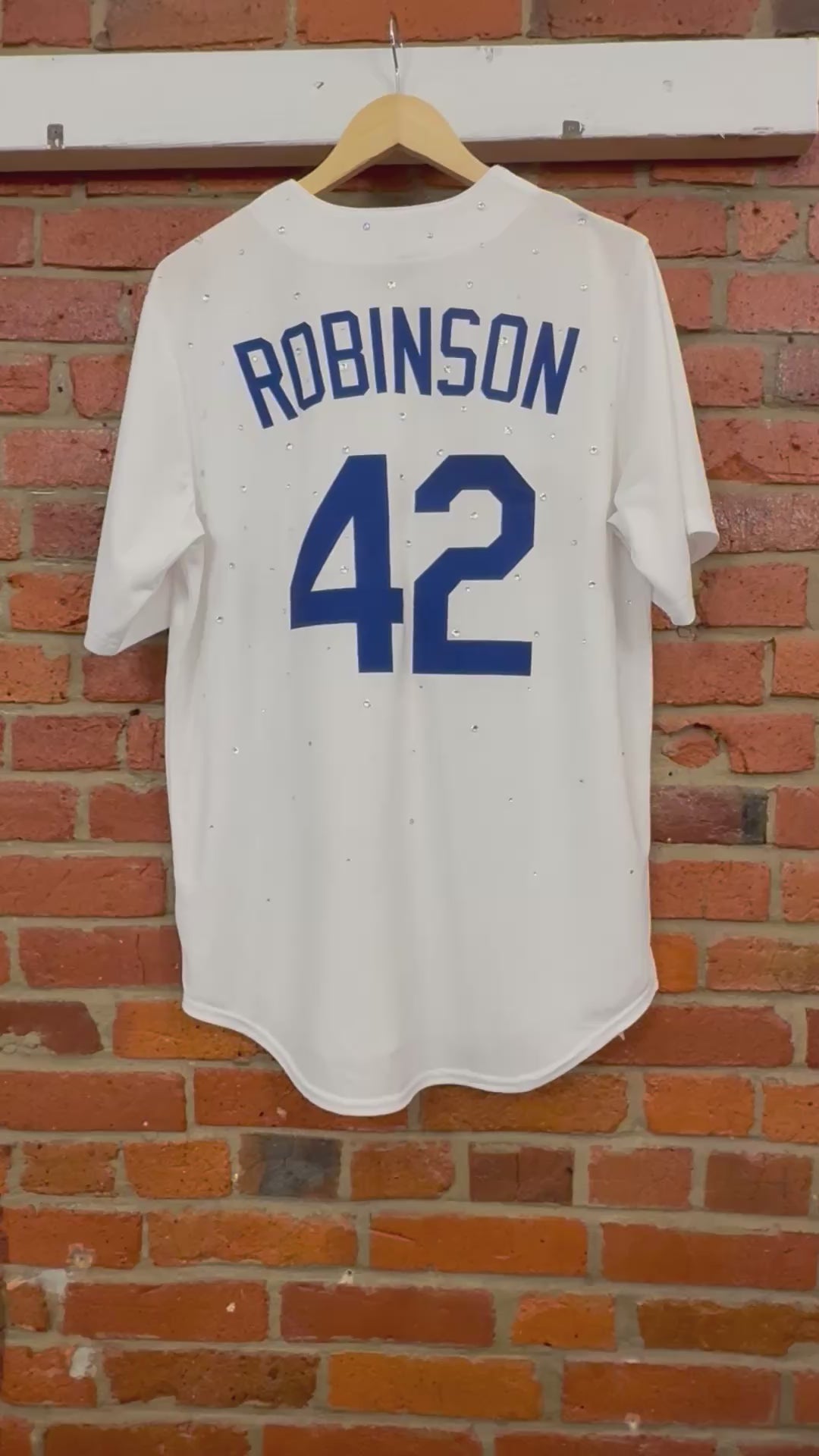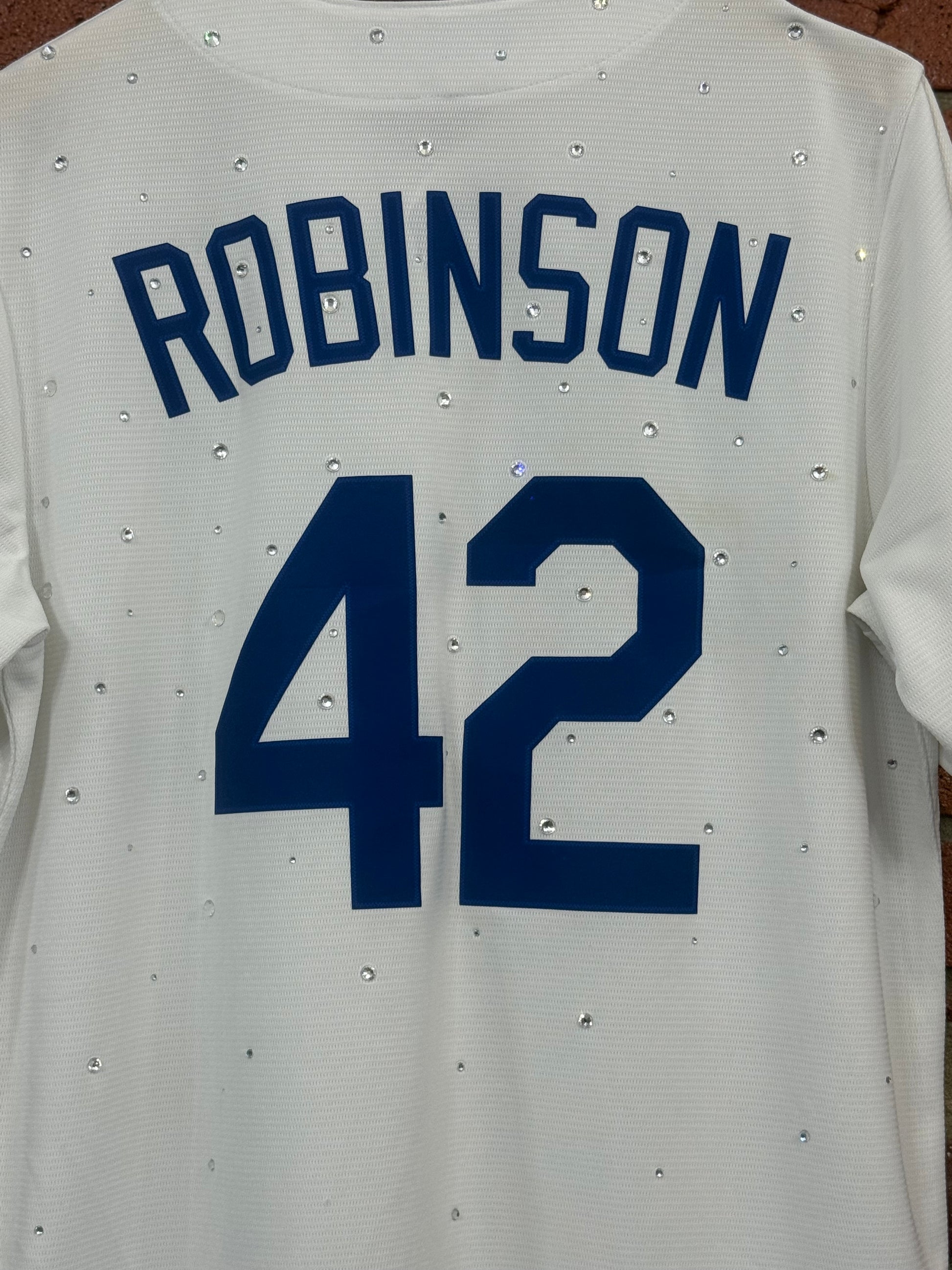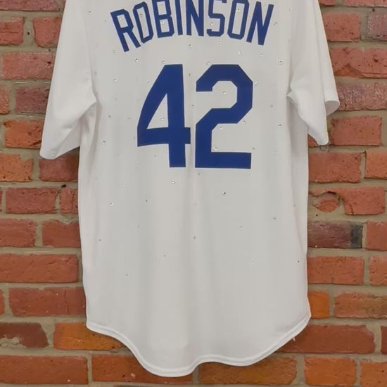 Expertly crafted and sustainably sourced, the 1 of 1 Jackie Robinson Jersey is a testament to quality and innovation. Made with upcycled materials, this jersey features a dazzling rhinestone design that celebrates the legacy of Jackie Robinson. Wear it with pride and make a positive impact on the environment.