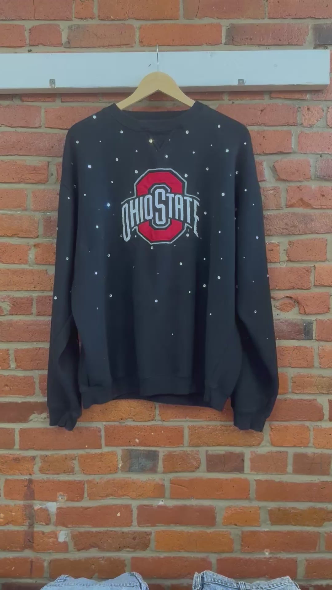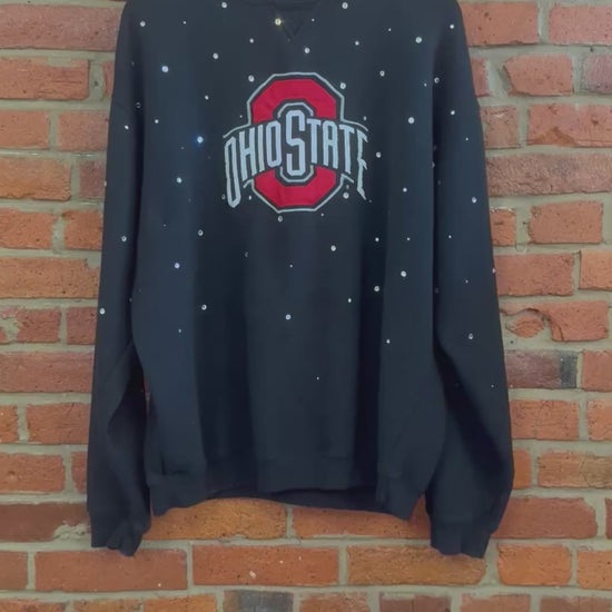 This upcycled Ohio State Crewneck showcases a stunning rhinestone design. Elevate your game day look with this unique and eye-catching feature. Add some sparkle and support your team in style. Perfect for any die-hard fan.