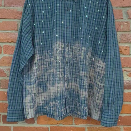 Upgrade your wardrobe with this 1 of 1 rhinestone button up shirt. Its unique design featuring rhinestones is made from upcycled materials, making it a sustainable choice for fashion lovers. Elevate your style while reducing your carbon footprint with this one-of-a-kind piece.