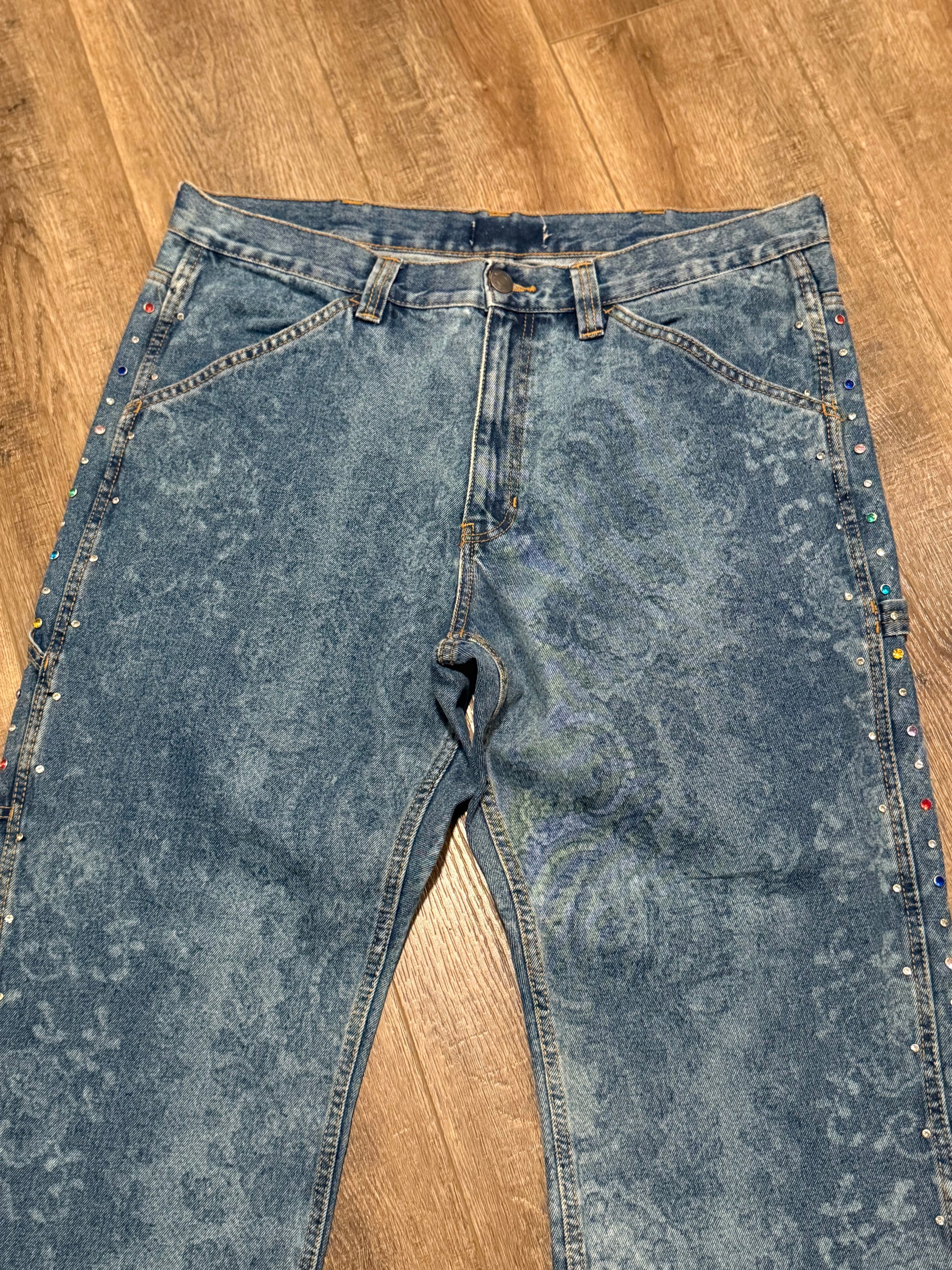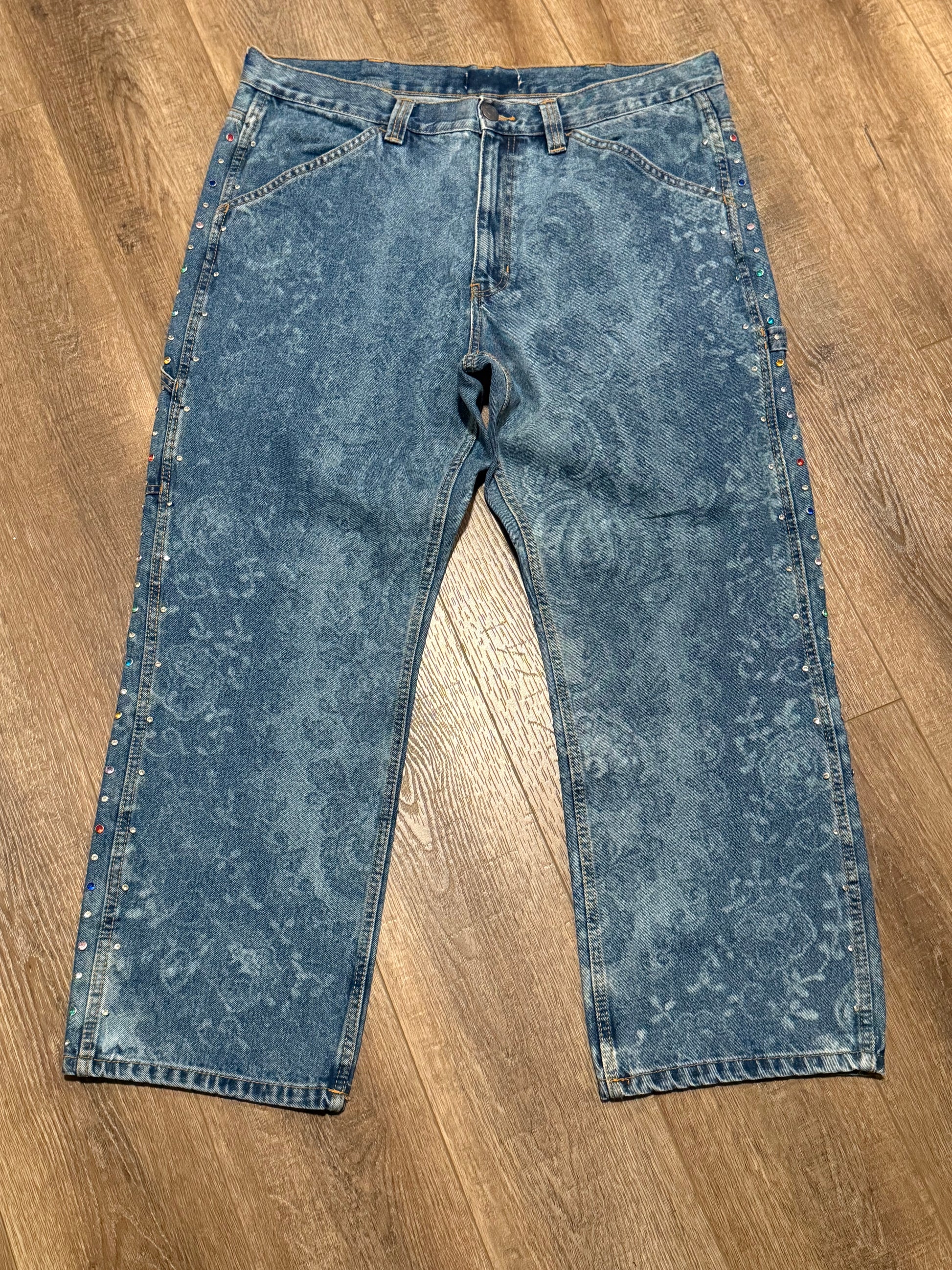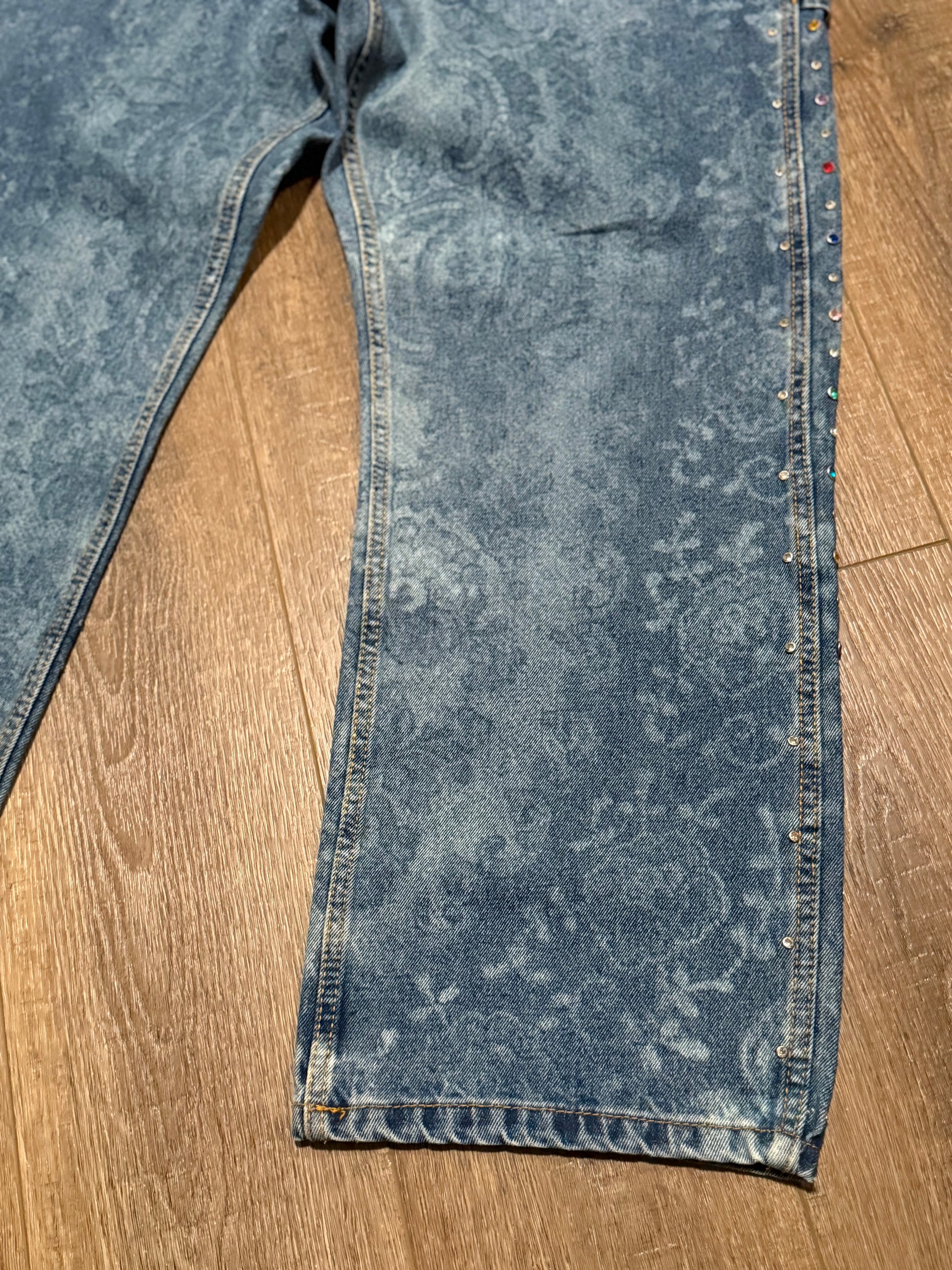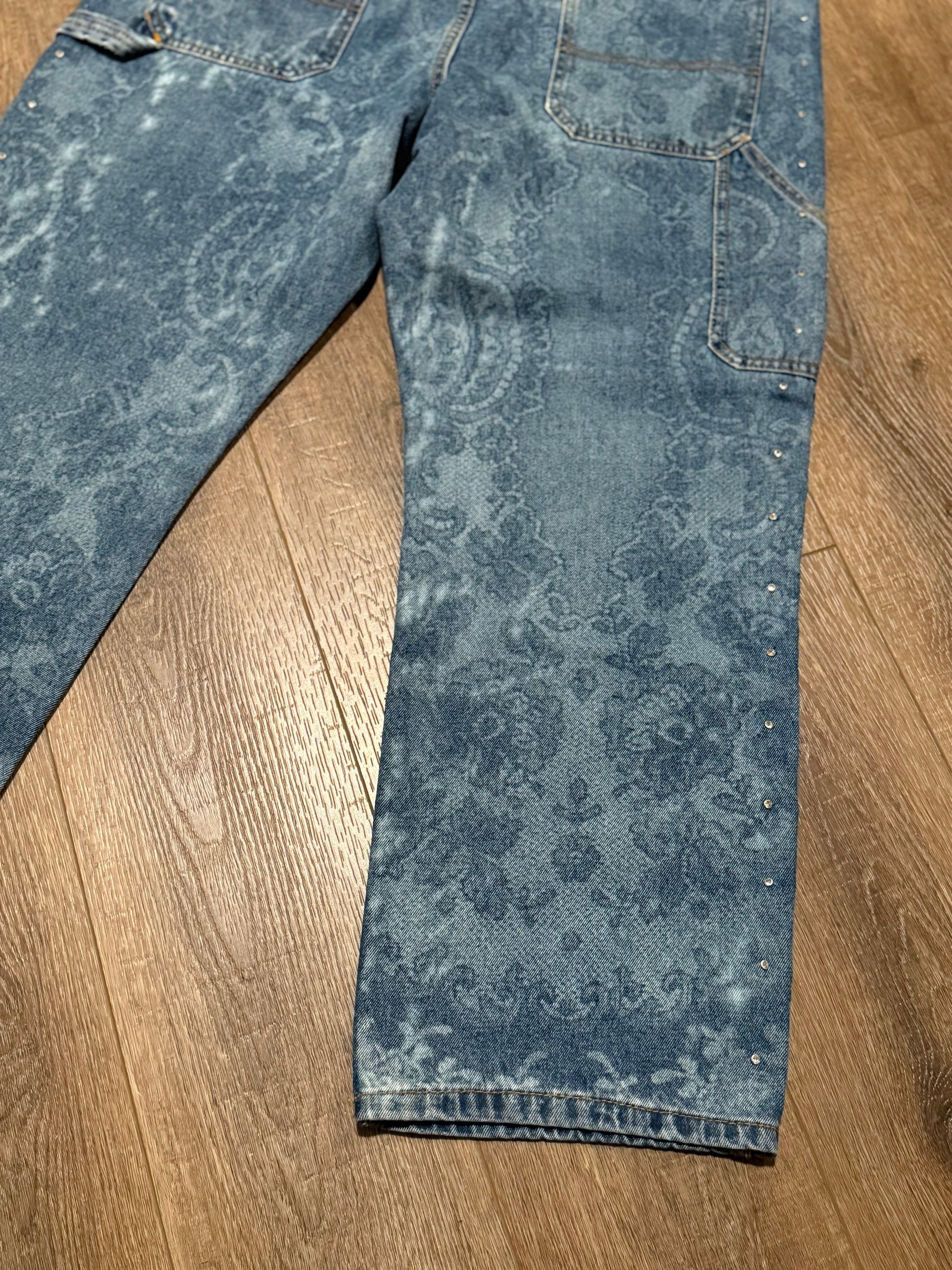 Pattern: The denim is treated with a faded, floral/baroque pattern throughout, giving them a vintage and ornamental look.