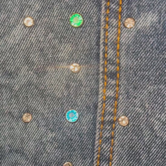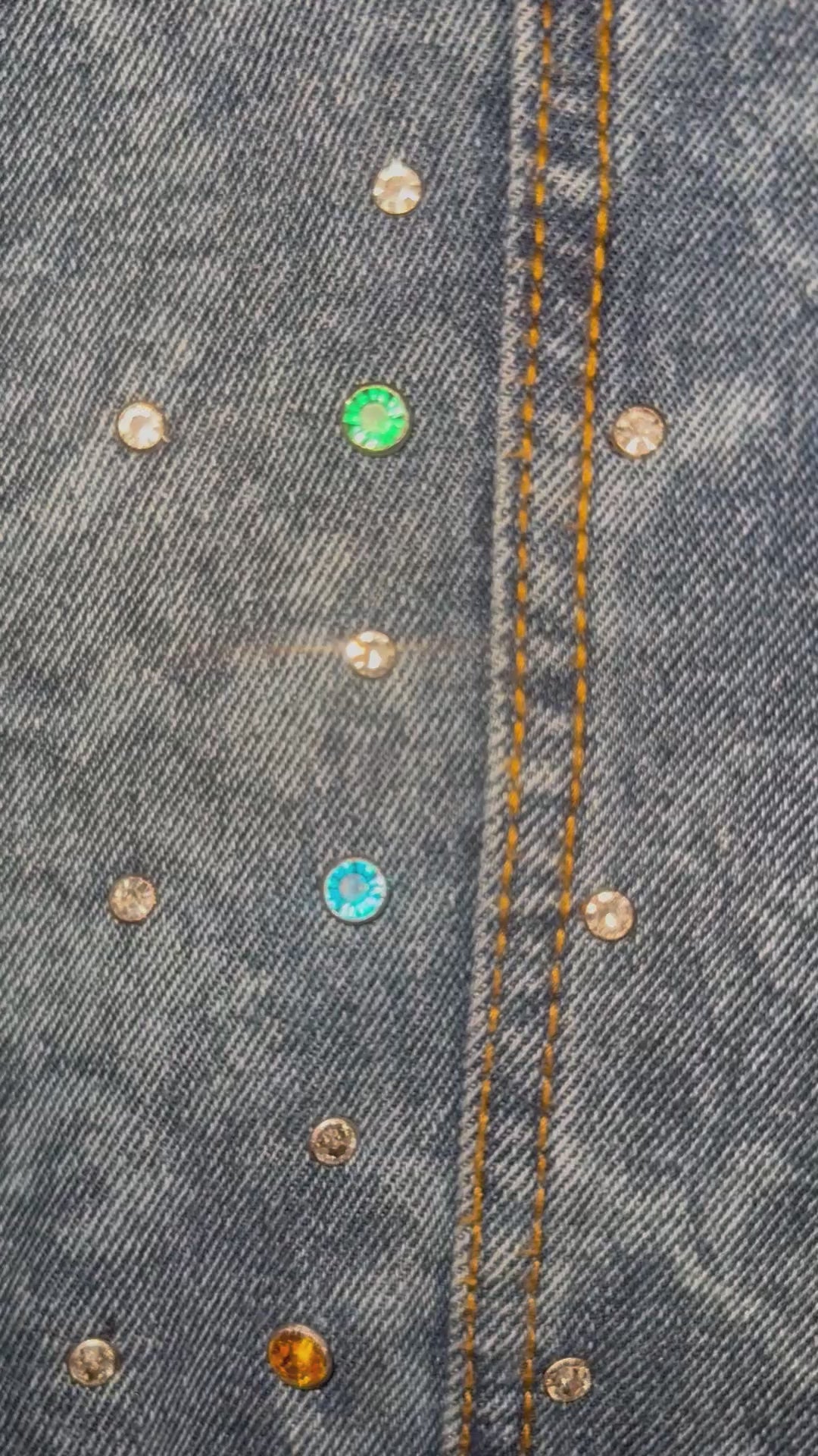 Embellishments: Along both outer side seams, there are multicolored studs or rhinestones running from the waist down to the hem, adding a flashy, decorative touch.