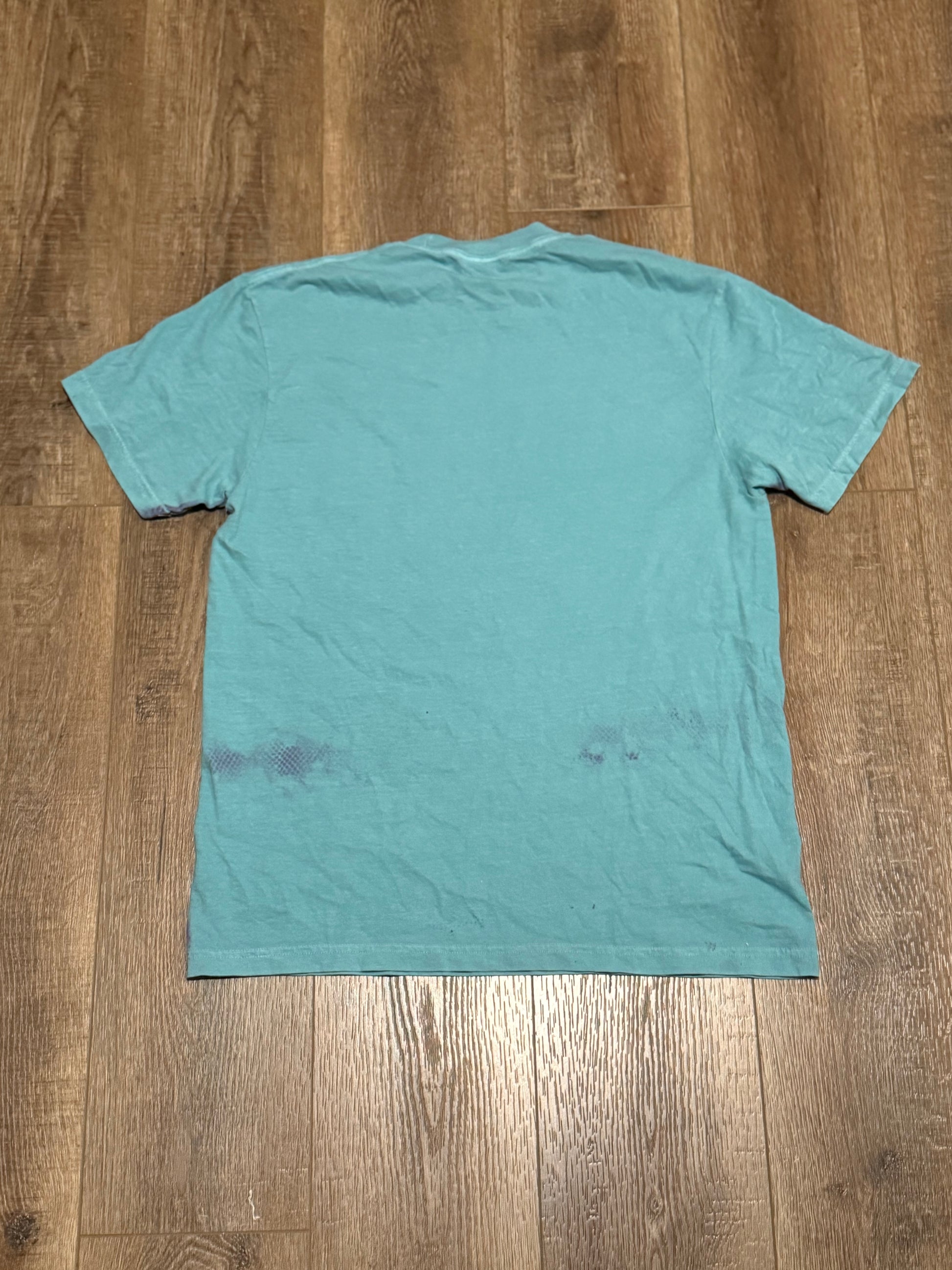 This is a short-sleeve t-shirt featuring a bold streetwear aesthetic. The base fabric has a turquoise effect blended with darker indigo accents, creating a stormy, marbled look. Overlaid on the shirt is a large, distressed black graphic across the chest that reads “UNKNOWN STORM” in an aggressive, graffiti-inspired font with jagged edges and irregular strokes. accented with subtle lace-like floral and patterned overlays across the torso, giving the shirt extra layers of texture and visual complexity. The overall vibe is a mix of vintage tie-dye, graffiti culture, and modern streetwear branding.