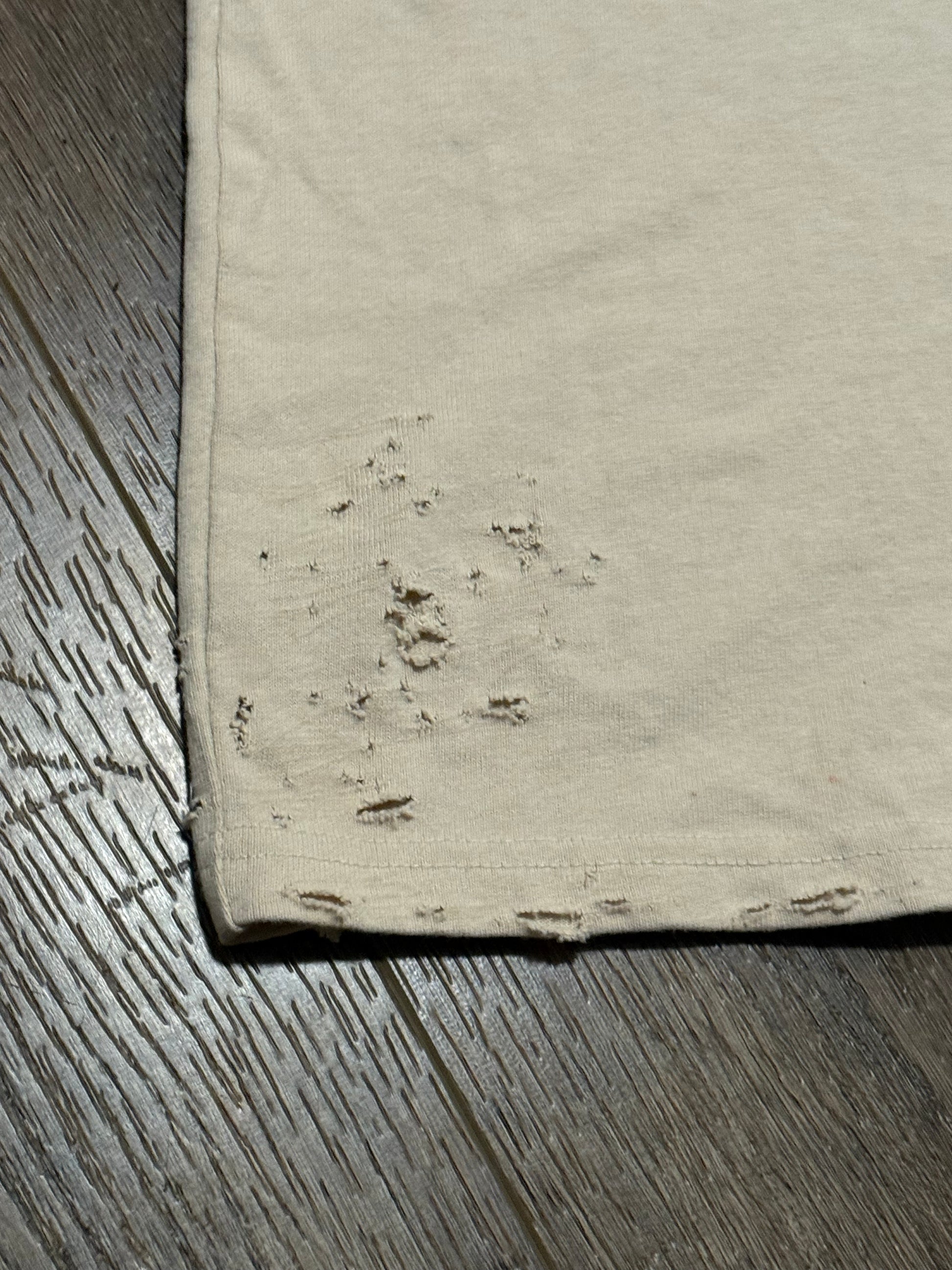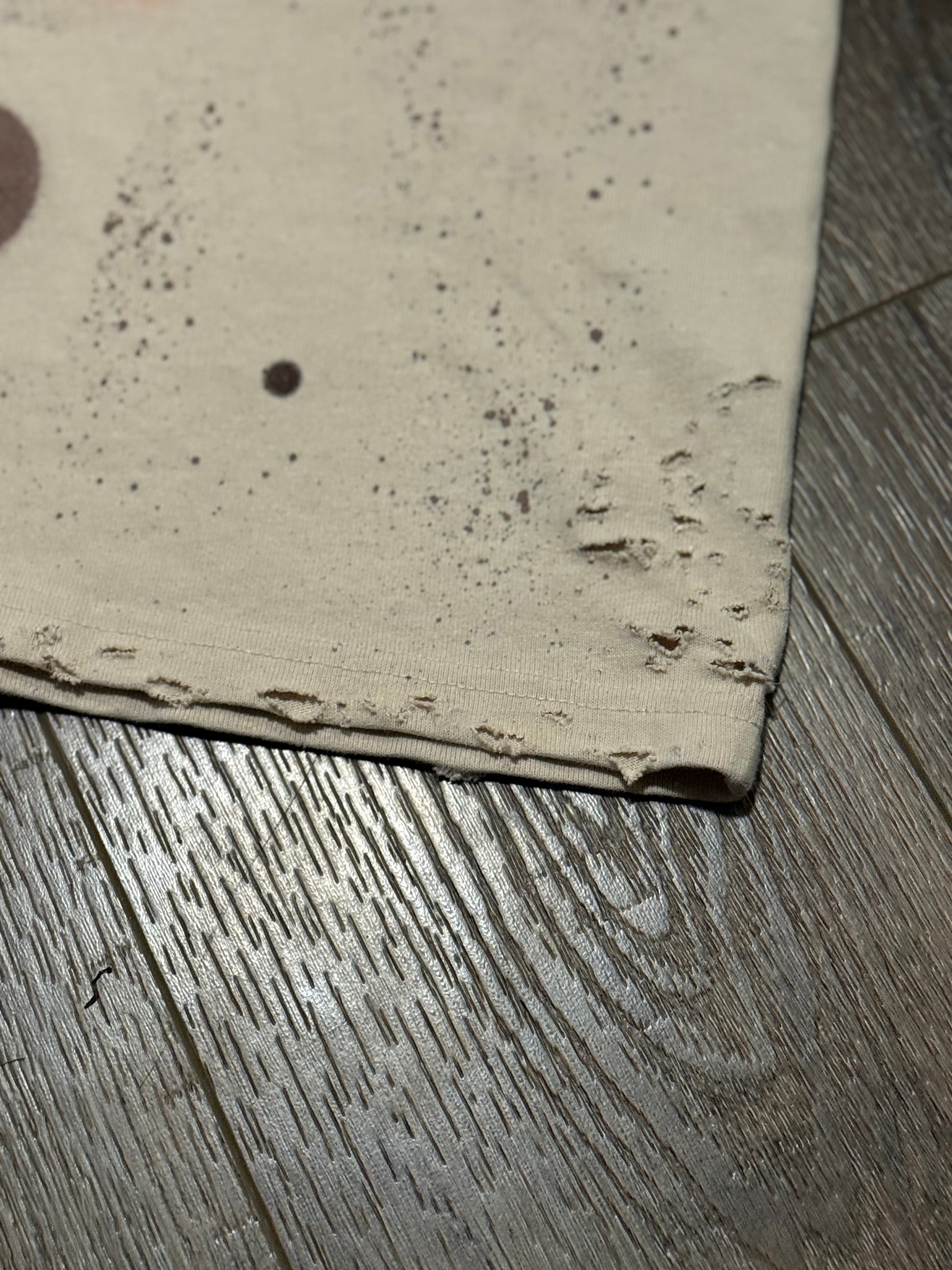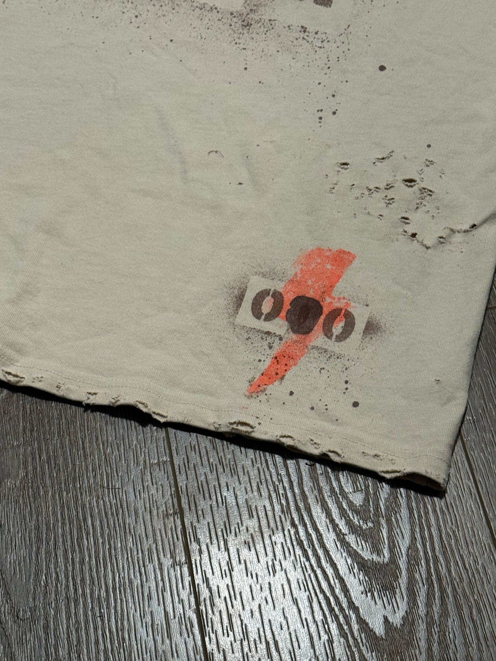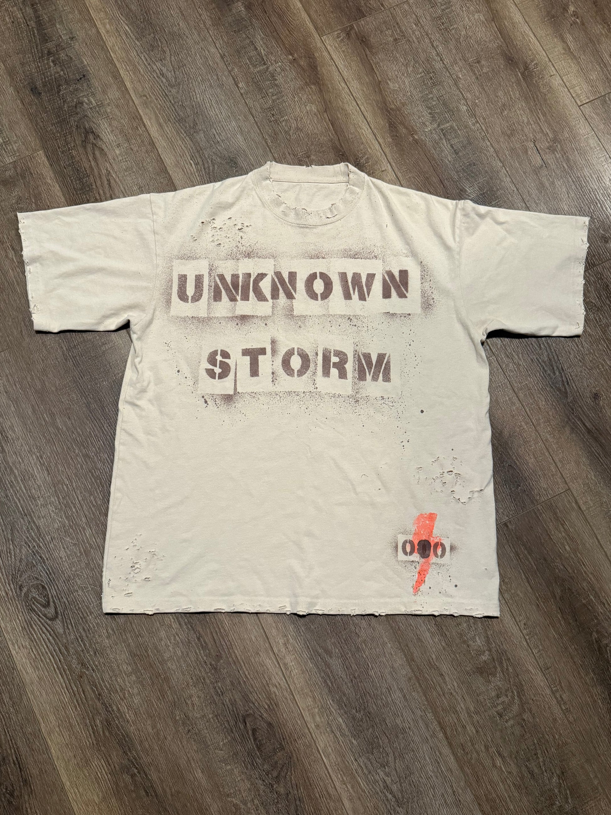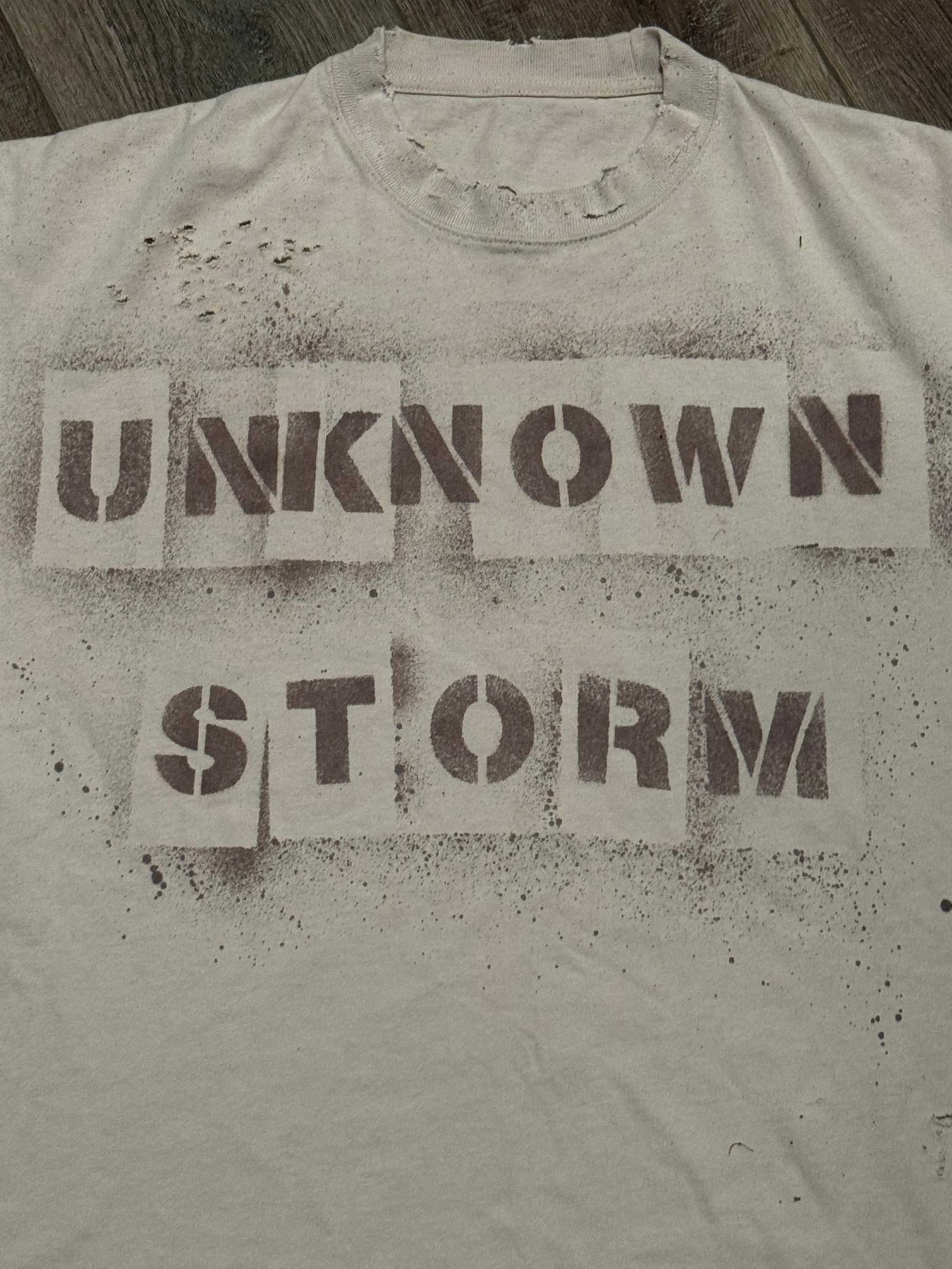 This distressed 1 of 1 tee features a unique Unknown Storm design. Stand out from the crowd with this one-of-a-kind t-shirt that combines style and quality. Made from premium materials and expertly crafted, this tee is perfect for any fashion-forward individual looking to make a statement.